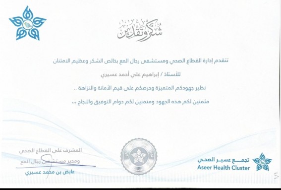 كرّم مستشفى رجال ألمع إبراهيم زياد، أحد منسوبي قسم الأمن، تقديرًا لأمانته بعد أن عثر على مبلغ مالي مفقود داخل أحد المواقع بالمستشفى، وقام بتسليمه إلى صاحبه بكل نزاهة ومسؤولية.
