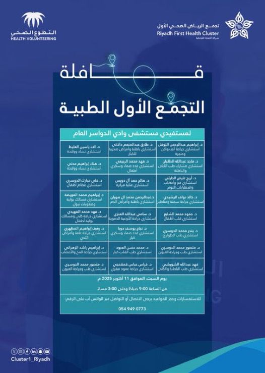 يواصل تجمع الرياض الصحي الأول تنفيذ مبادرة القوافل الطبية، حيث تُقدَّم الخدمات الصحية المتخصصة يوم السبت الموافق 11 أكتوبر 2025، من الساعة التاسعة صباحًا حتى الثالثة عصرًا، في مستشفى وادي الدواسر ومستشفى السليل، بمشاركة نخبة من الاستشاريين في مختلف التخصصات الطبية.