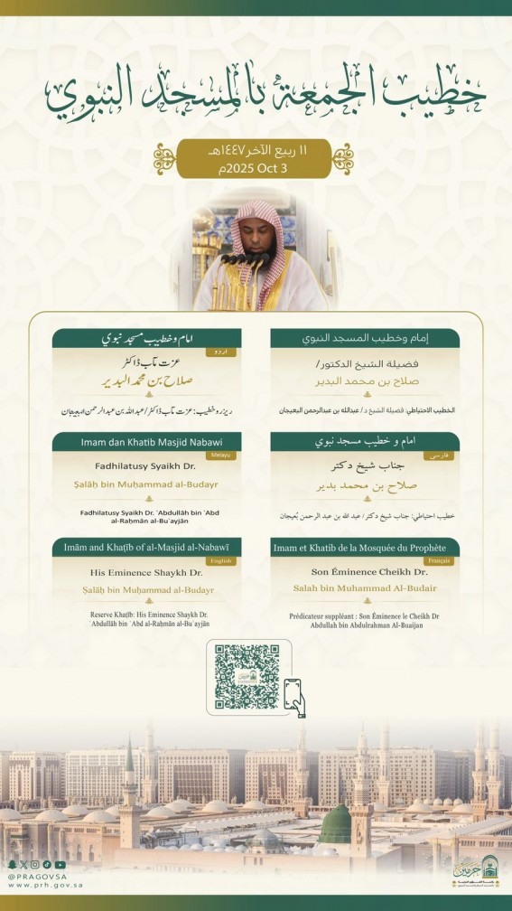 أعلنت رئاسة الشؤون الدينية بالمسجد الحرام والمسجد النبوي عن أسماء أصحاب الفضيلة الأئمة والخطباء الذين سيتشرفون بإمامة المصلين وإلقاء خطبة الجمعة يوم الجمعة القادمة، الموافق 11 ربيع الآخر 1447هـ، ضمن جدولها الدوري المعتمد لتنظيم شؤون الإمامة والخطابة.