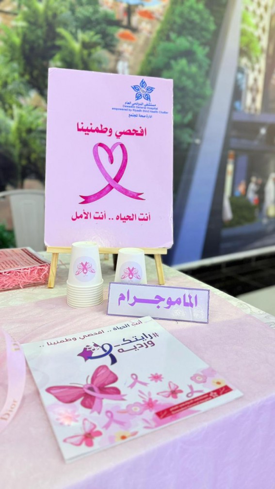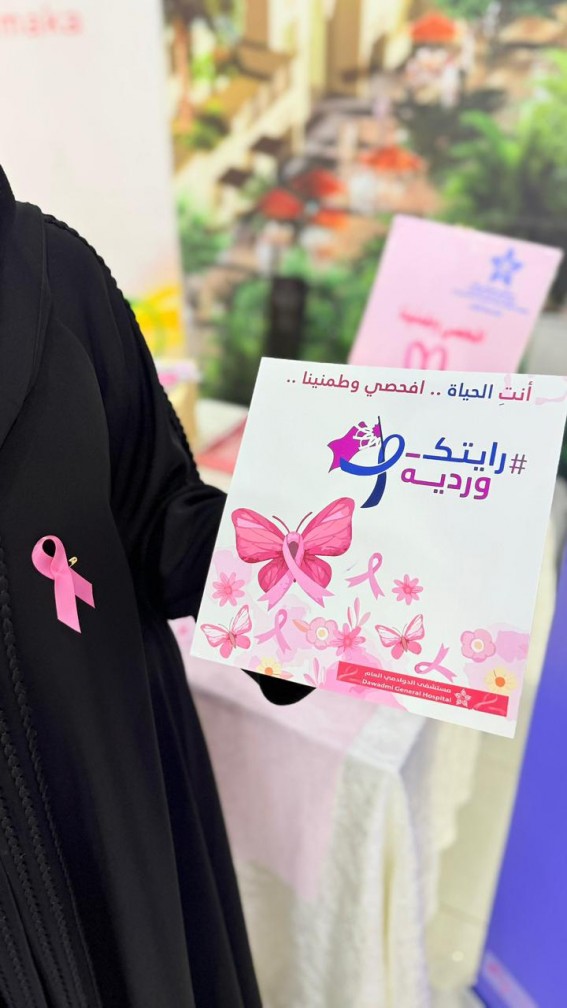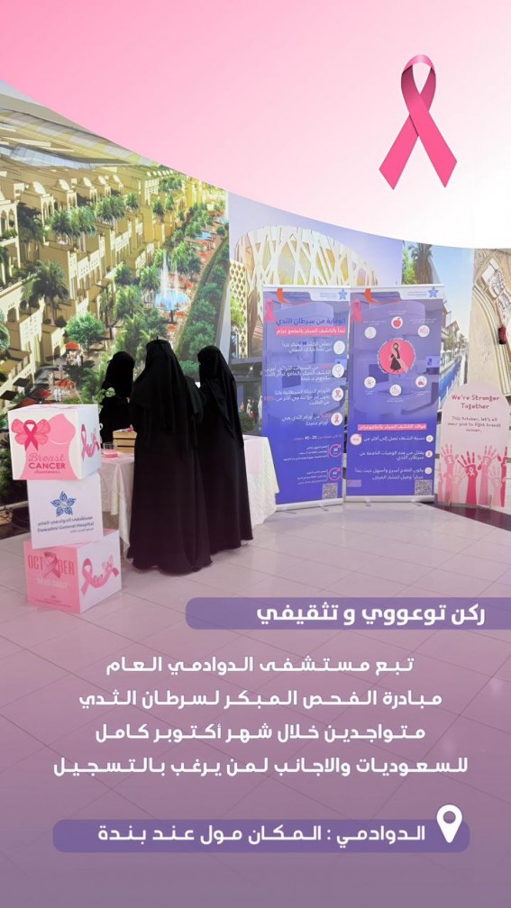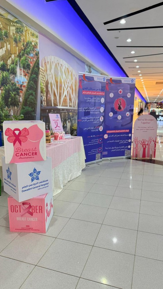 أطلقت مديرية الشؤون الصحية بمحافظة الدوادمي بالتعاون مع جمعية عناية الصحية ومجمّع المكان مول، مساء اليوم، فعالية توعوية بعنوان الوقاية من سرطان الثدي – مبادرة الفحص المبكر، وذلك ضمن أنشطة الشهر العالمي للتوعية بسرطان الثدي (أكتوبر الوردي).