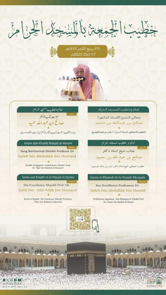 أعلنت رئاسة الشؤون الدينية بالمسجد الحرام والمسجد النبوي الشريف، عن أسماء خطيبي الجمعة في الحرمين الشريفين لليوم 25 من شهر ربيع الآخر 1447هـ.