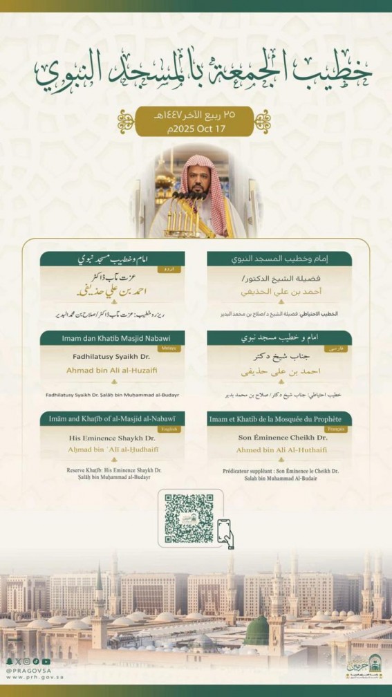 فيما سيخطب ويؤم المصلين في المسجد النبوي فضيلة الشيخ الدكتور أحمد الحذيفي.