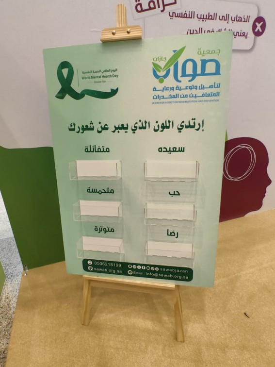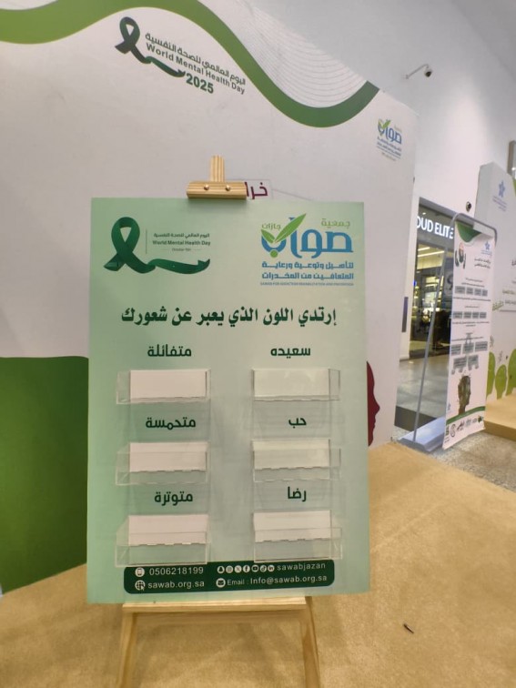شاركت جمعية صواب في فعاليات اليوم العالمي للصحة النفسية المقامة في كادي بارك بمنطقة جازان، مجسّدةً التزامها بدورها التوعوي في تعزيز مفاهيم الرفاه النفسي وجودة الحياة، وساعيةً إلى ترسيخ ثقافة العناية بالصحة النفسية كأحد ركائز المجتمع المتوازن.