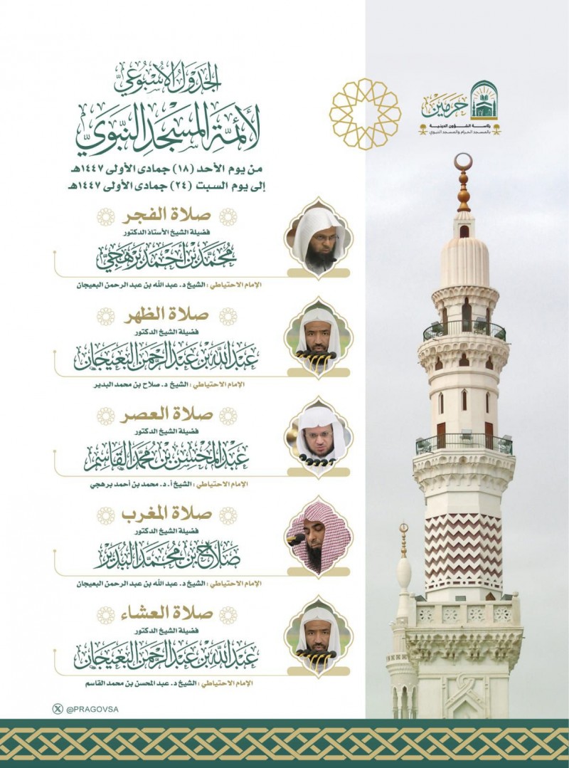 وفي المسجد النبوي الشريف بالمدينة المنورة يؤم المصلين في صلاة الفجر فضيلة الشيخ الأستاذ الدكتور محمد بن أحمد برهجي، وفي صلاتي الظهر والعشاء فضيلة الشيخ الدكتور عبدالله بن عبدالرحمن البعيجان، وفي صلاة العصر فضيلة الشيخ عبدالمحسن بن محمد القاسم، بينما يؤم صلاة المغرب فضيلة الشيخ الدكتور صلاح بن محمد البدير.