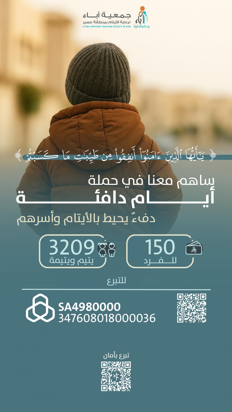 ودعت جمعية آباء جميع المحسنين والداعمين إلى المساهمة في هذه الحملة، مؤكدة أن كل تبرع – مهما كان حجمه – يسهم في صناعة دفءٍ وابتسامةٍ في حياة يتيم يحتاج إلى العون.