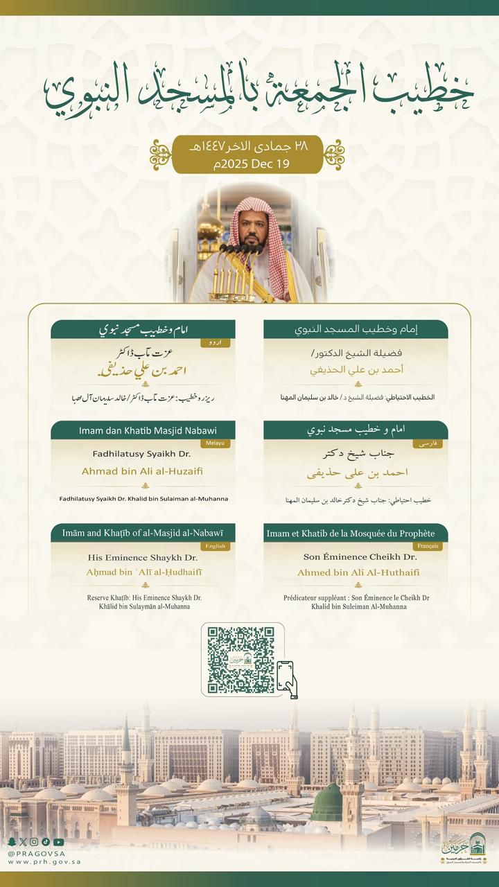 وسيؤم المصلين ويلقي خطبة الجمعة في المسجد الحرام فضيلة الشيخ الدكتور ماهر المعيقلي فيما يتولى فضيلة الشيخ الدكتور أحمد الحذيفي إمامة المصلين وإلقاء خطبة الجمعة في المسجد النبوي الشريف.