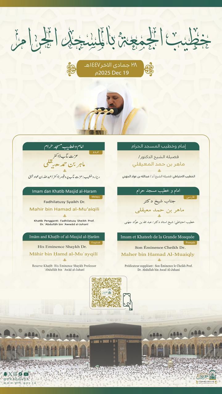 اعتمدت رئاسة الشؤون الدينية بالمسجد الحرام والمسجد النبوي أسماء خطباء وأئمة صلاة الجمعة في الحرمين الشريفين ليوم الجمعة 28 جمادى الآخرة 1447هـ، وذلك ضمن جدولها الدوري لتنظيم شؤون الإمامة والخطابة.