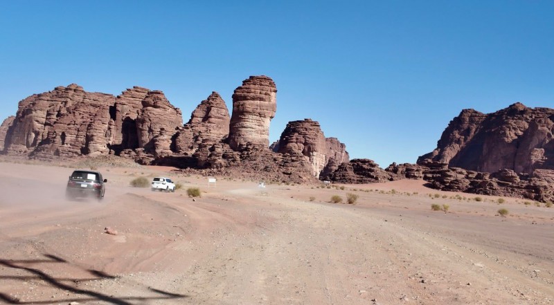 وتواصلت الجولة بزيارة مطل حسمى (هضبة حسمى)، الذي يُعد من أجمل المواقع الجيولوجية في منطقة تبوك، ويتميز بتضاريسه الصخرية المدهشة ورماله الحمراء الخلابة، حيث تتكون الهضبة من صخور الحجر الرملي التي تعود لملايين السنين، وتبرز فيها ظاهرة “الغراميل” على هيئة أعمدة ومنحوتات صخرية طبيعية.