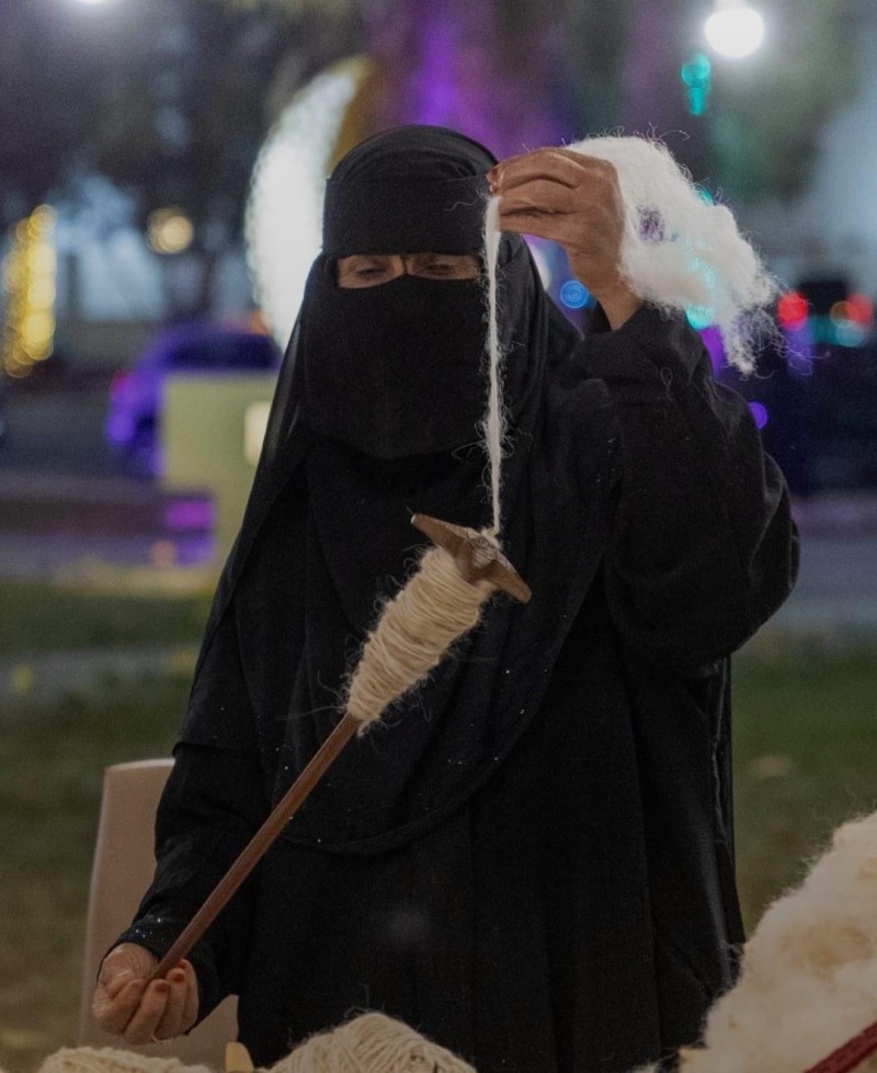 واستعرضت المشاركات آلية استخدام المغزل في غزل الصوف والوبر، مرورًا ببرم الخيوط وتمديدها وصولًا إلى نسج السدو والمفارش، في مهنة عُرفت قديمًا بكونها عملًا يوميًا يستغرق ساعات طويلة، وأسهمت في تلبية احتياجات المنازل من المنسوجات التقليدية، مستمدة أدواتها من موارد البيئة المحلية.