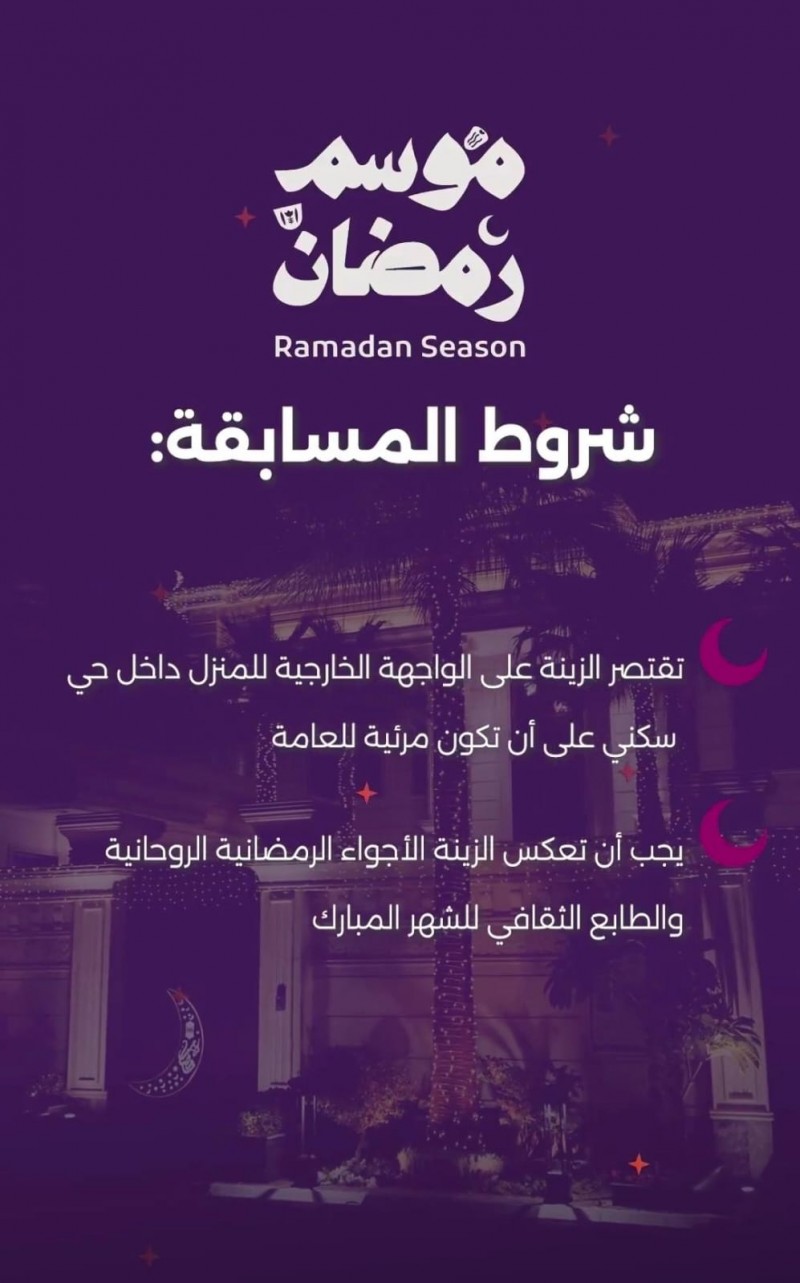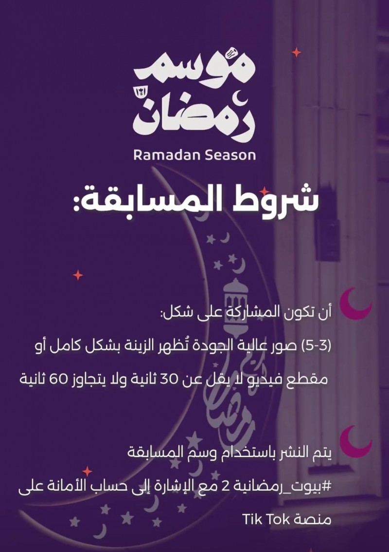 وأوضحت الأمانة أن المشاركة متاحة لجميع أفراد المجتمع، مع فرصة للفوز بجوائز قيمة، مشيرة إلى أن المسابقة تهدف أيضًا إلى تعزيز الانتماء للمجتمع وتحفيز الإبداع في تزيين المنازل والمرافق العامة بما يرفع مستوى المشهد الحضري ويعكس روح الشهر الكريم.