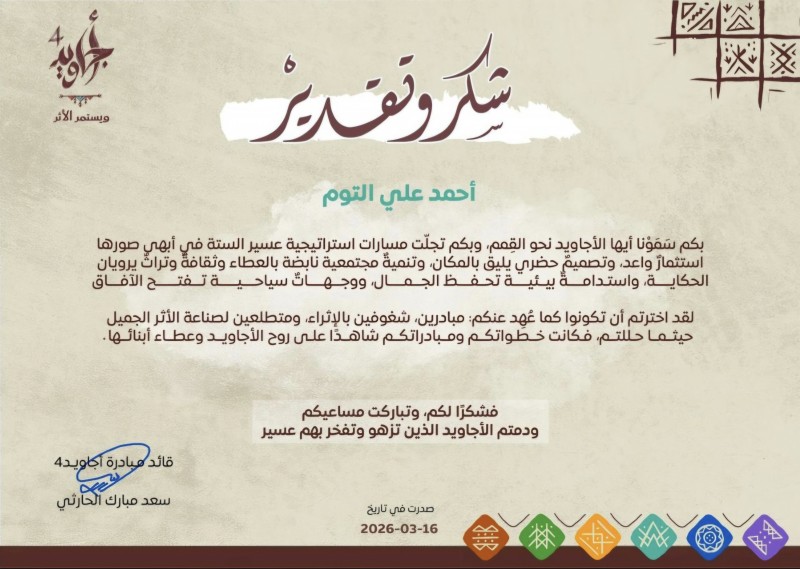 كرّمت مبادرة أجاويد 4 بمنطقة عسير الأستاذ أحمد بن علي التوم تقديرًا لمساهماته البارزة في تطوير مسارات استراتيجية عسير الستة، وتعزيز المشاريع المجتمعية والثقافية والسياحية في مركز وسانب.