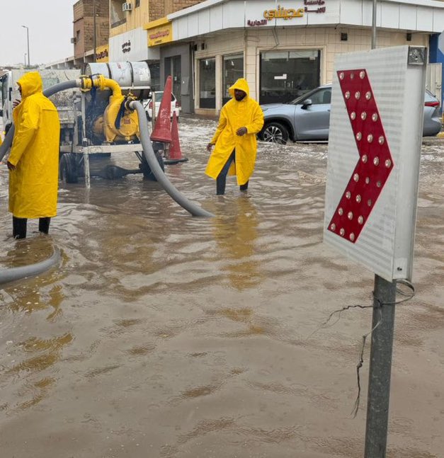 كما تعمل الفرق على سحب تجمعات المياه في المواقع غير المؤهلة بشبكات التصريف للحد من آثار الأمطار وتعزيز سلامة الطرق.