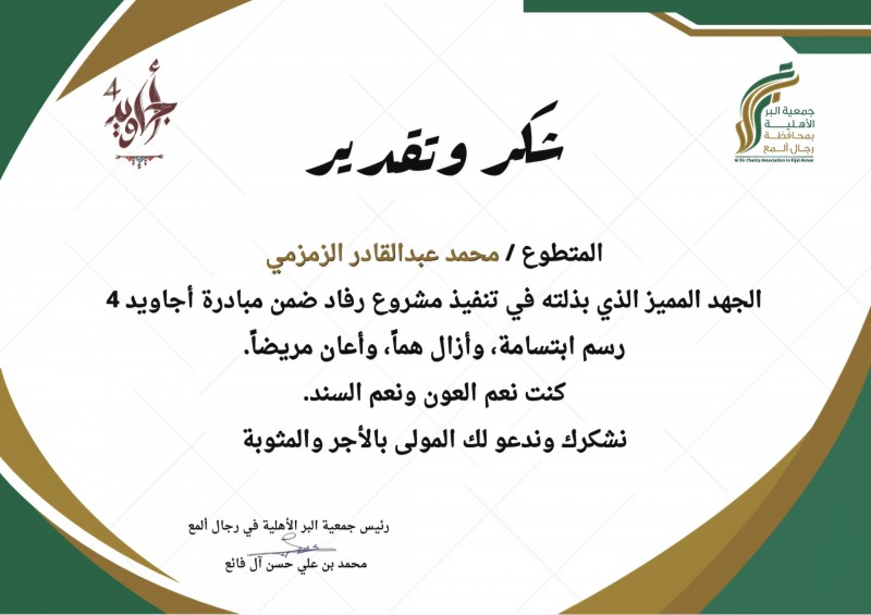قدّمت جمعية البر الأهلية في رجال ألمع شهادة شكر وتقدير للأستاذ محمد عبدالقادر الزمزمي نظير جهوده المبذولة في تنفيذ مشروع رفاد ضمن مبادرة أجاويد 4، والتي أسهمت في رسم الابتسامة، وتخفيف الألم، ومساندة المرضى.