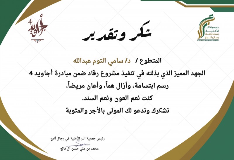 كما عبّر رئيس الجمعية الأستاذ محمد بن علي حسن آل طالع عن شكره وتقديره للدكتور سامي التوم، مؤكدًا أن جهوده شكّلت عنصرًا مهمًا في نجاح المشروع وتحقيق أهدافه الإنسانية، وأن الجمعية تفخر بالنماذج التي تُجسّد قيم العمل المجتمعي.
