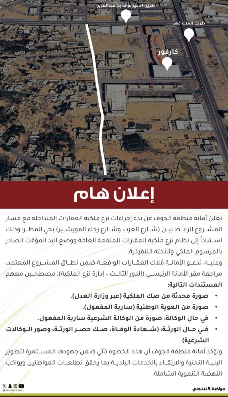 تعلن أمانة منطقة الجوف بدء إجراءات نزع ملكية العقارات المتداخلة مع مسار المشروع الرابط بين شارع العرب وشارع رجاء المويشير في حي المطر بمدينة سكاكا، وذلك ضمن جهودها المستمرة لتطوير البنية التحتية ورفع جودة الحياة.